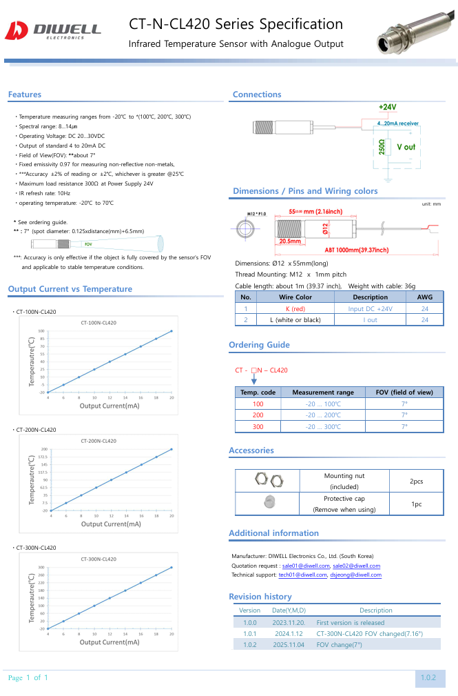 비접촉 온도 측정 / 열충격 Active 보상 기능 / 측정온도 : -20~300℃ / FOV : 7° / 출력 : 4~20mA