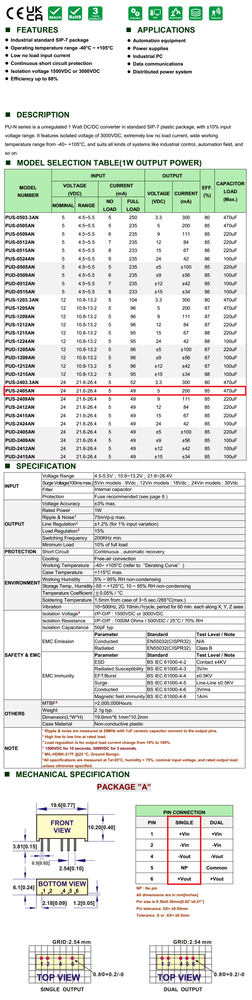 입력: 24V 출력: 5V/200mA/1W CE,RoHS 인증 1.5KV 절연으로 우수한 신뢰성