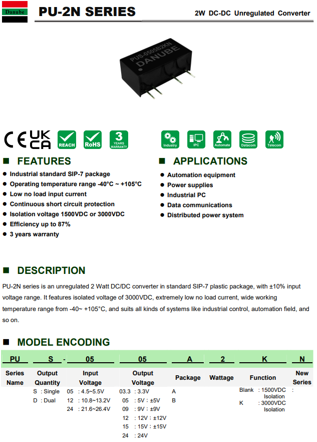 입력: 12V 출력: 5V/400mA/2W RoHS 인증 1.5KV 절연으로 우수한 신뢰성