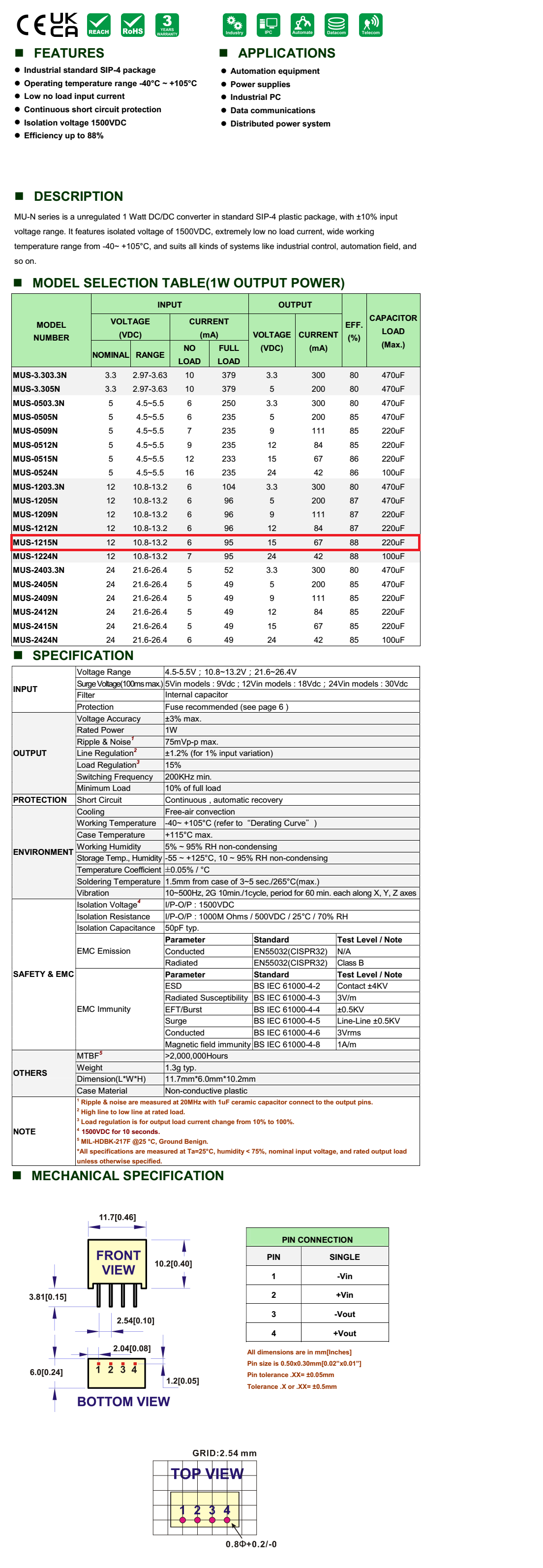 입력: 12V 출력: 15V/67mA/1W CE,RoHS 인증 1.5KV 절연으로 우수한 신뢰성